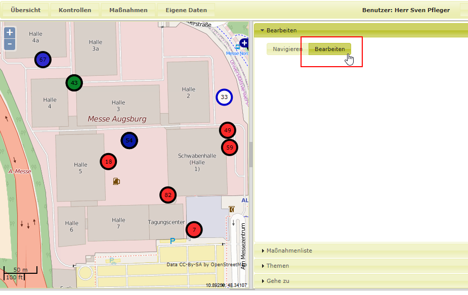 Wenn die Karte der gewünschten Liegenschaft mit den Maßnahmen geöffnet wurde, klicken Sie innerhalb der Toolbox auf den Reiter „Bearbeiten“ und klicken den Button „Bearbeiten“ an (statt „Navigieren“).