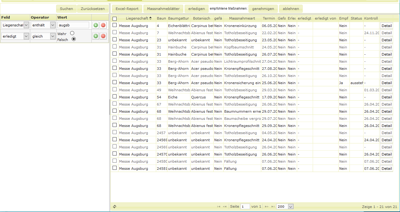 Die Maßnahmenliste gliedert sich in drei Bereiche: Auf der linken Seite befinden sich die Filter, rechts finden Sie die Tabelle und darüber die Funktionstasten.