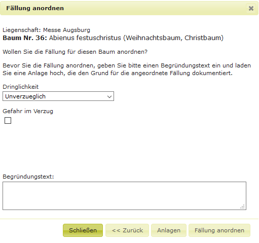 Hier können Sie die Dringlichkeit festlegen, aus der dann der Termin für die Fällung berechnet wird. In jedem Fall sollten Sie in das Feld Begründungstext eine Begründung für die Fällung angeben.