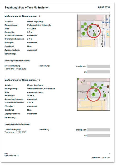 Maßnahmeblätter eignen sich insbesondere für diejenigen, die gern mit Zettel und Stift unterwegs sind. Als Maßnahmeblätter werden die offenen Maßnahmen als PDF-Formular zum Ausdrucken abgerufen. Für jeden Baum ist mit einem Kartenausschnitt gekennzeichnet wo der Baum liegt und welche Maßnahmen dort fällig sind. Hier ein Beispiel für das Maßnahmenblatt: