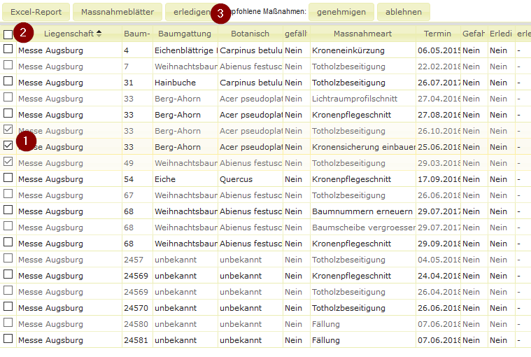 In der Maßnahmenliste lassen sich die Maßnahmen in Masse erledigen. Dazu wählen Sie die Maßnahmen einzeln durch das Setzen eines Hakens auf der linken Seite der jeweiligen Zeile (1) oder insgesamt alle auf der aktuellen Tabellenseite geladenen Maßnahmen über das Setzen eines Hakens im Kopf der Tabelle (2) aus. Anschließend klicken Sie auf die Schaltfläche erledigen (3).