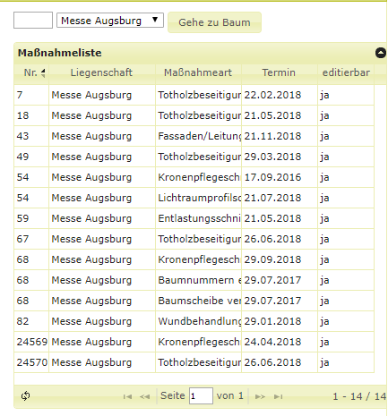 Im Reiter Maßnahmenliste werden die Maßnahmenarten angezeigt, die zuvor in der Übersicht gefiltert wurden, zusätzlich sehen Sie die zugehörige Liegenschaft. Durch Klicken auf eine Maßnahme in der Liste wird die entsprechende Maßnahme auf der Karte zentriert und Sie können die Maßnahme bei Bedarf wie gewohnt bearbeiten.